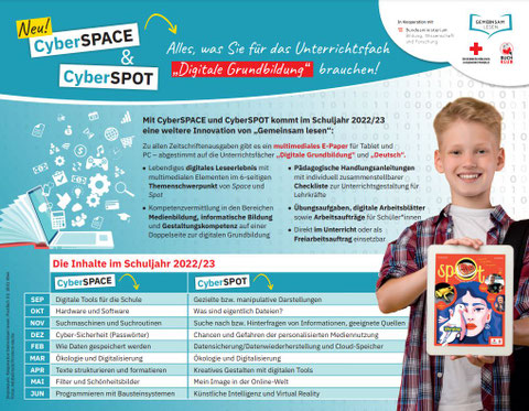Mit CyberSPACE beziehungsweise CyberSPOT bekommen Pädagoginnen und Pädagogen je 9 E-Paper-Ausgaben (für Tablet und PC) zum jeweiligen Heftschwerpunkt der Schülerzeitschriften SPACE beziehungsweise SPOT – mit zahlreichen Arbeitsaufträgen und Stundenbildern. Die Medien sind abgestimmt auf den digital-unterstützten Deutschunterricht und den Pflichtgegenstand „Digitale Grundbildung“ (nach dem Lehrplan 2022/23).