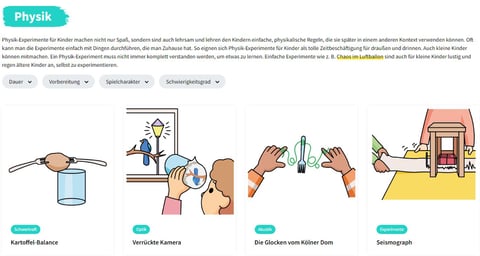 Experimente nach Themen und Altersgruppen aufgelistet